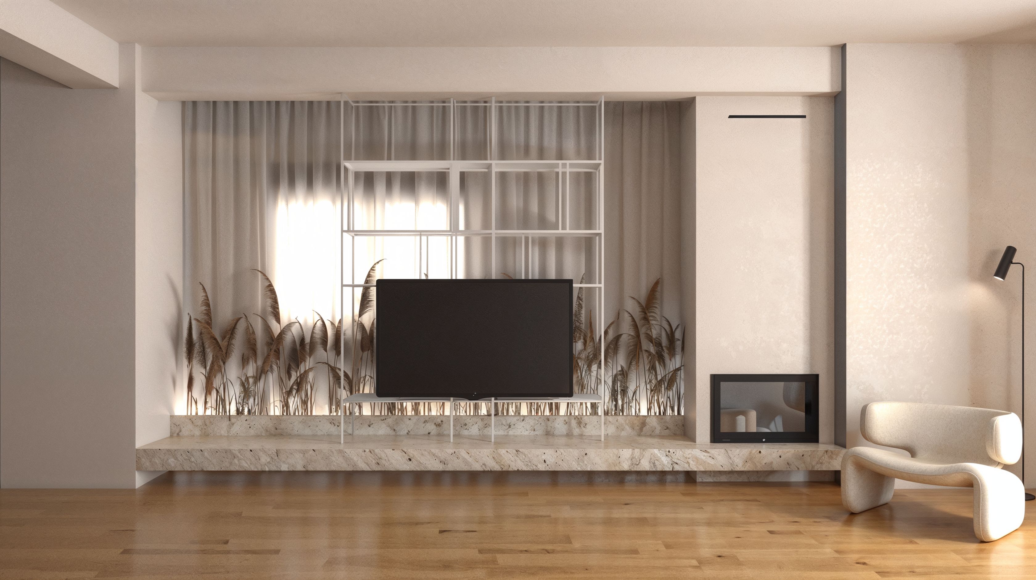 A warm, neutral palette defines the space, creating a sense of harmony and understated elegance. Natural materials, including travertine marble and oak wood, bring tactile richness and subtle luxury, while soft textures and carefully curated furnishings enhance comfort and livability.